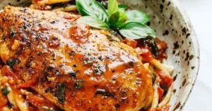 Pui cu usturoi şi busuioc în sos de unt și roşii